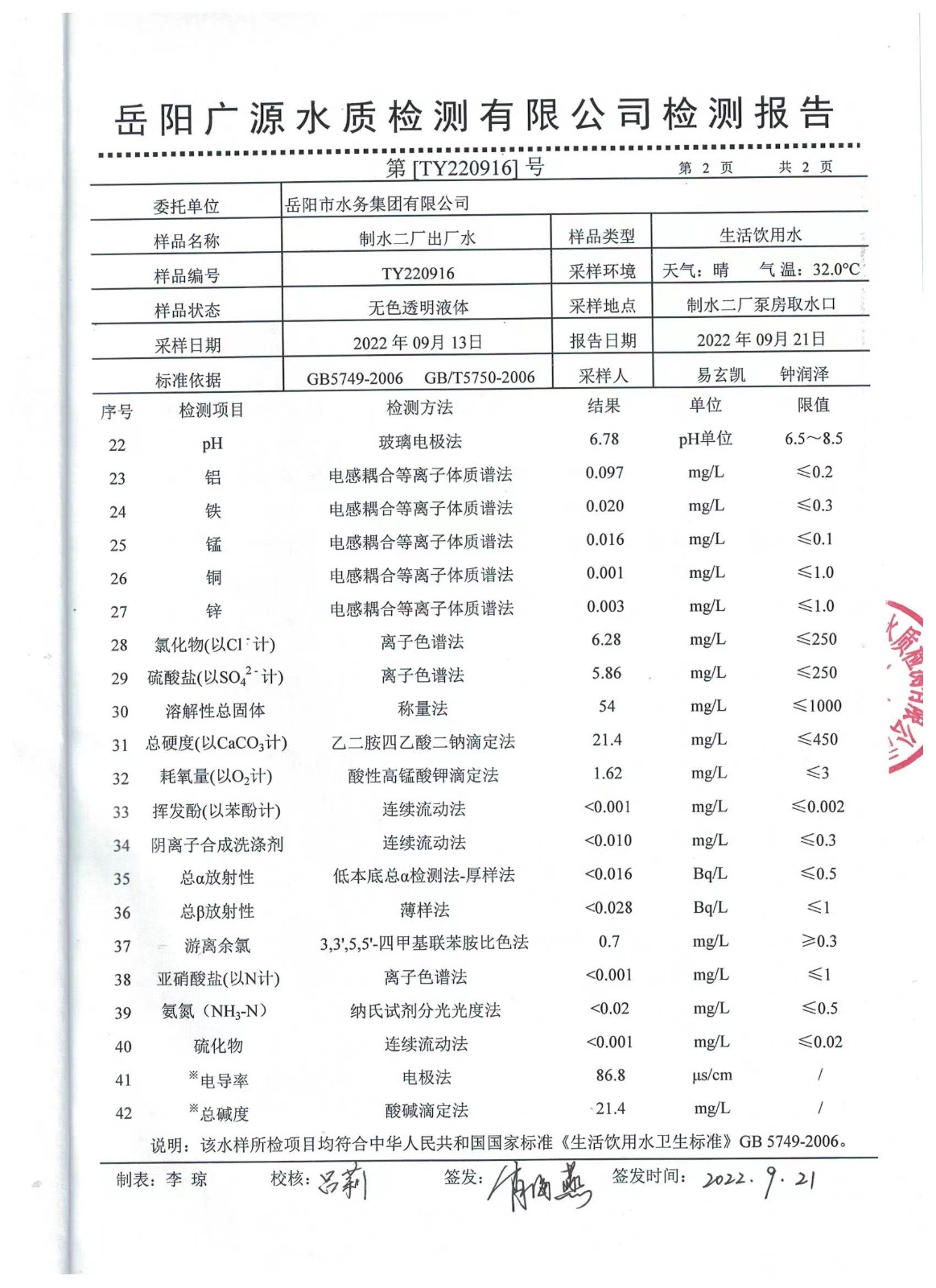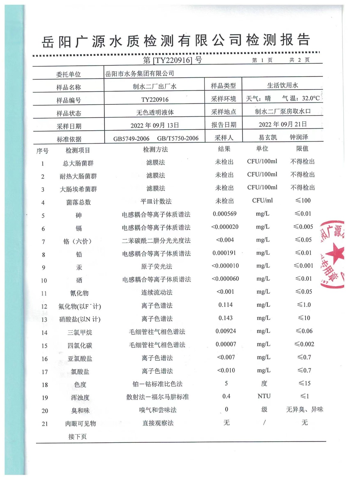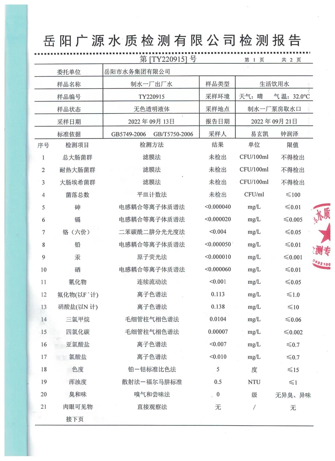 下一篇:2022年09月岳陽市水務(wù)集團(tuán)水源水水質(zhì)檢測月報(bào)表