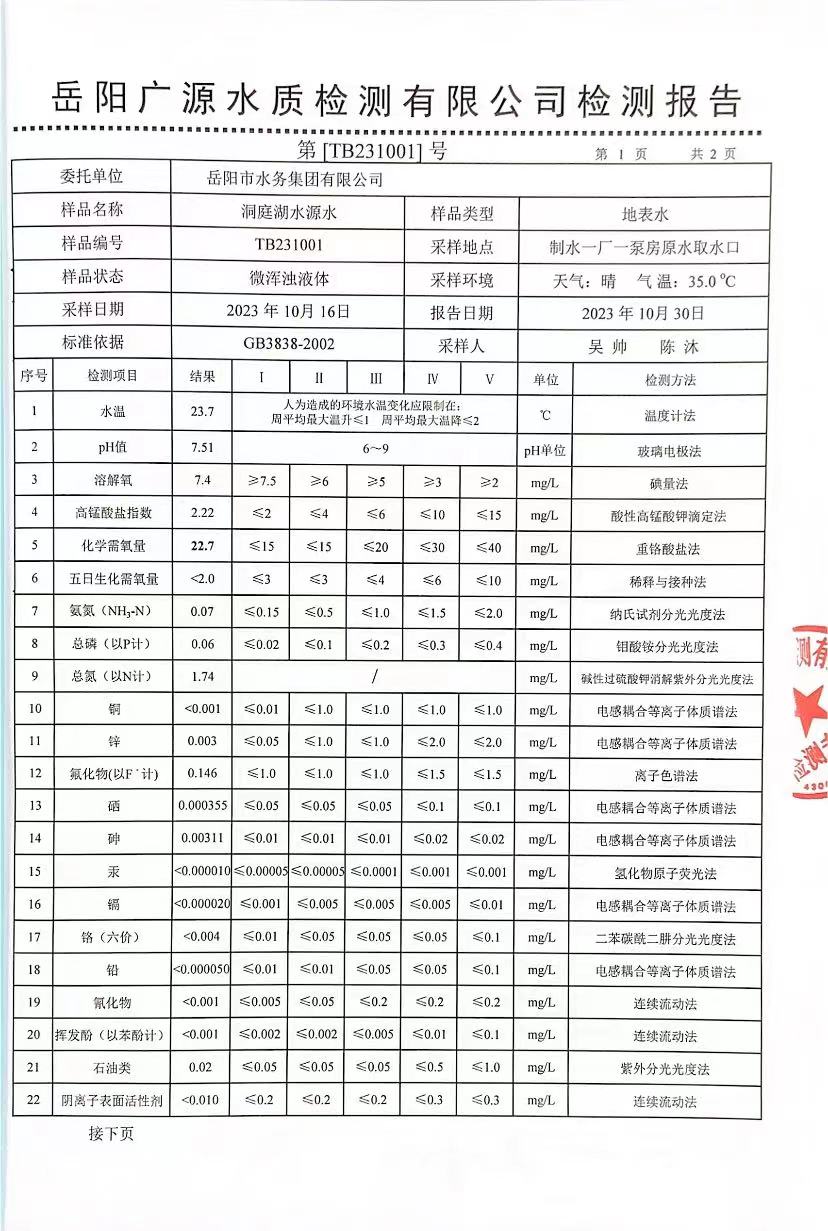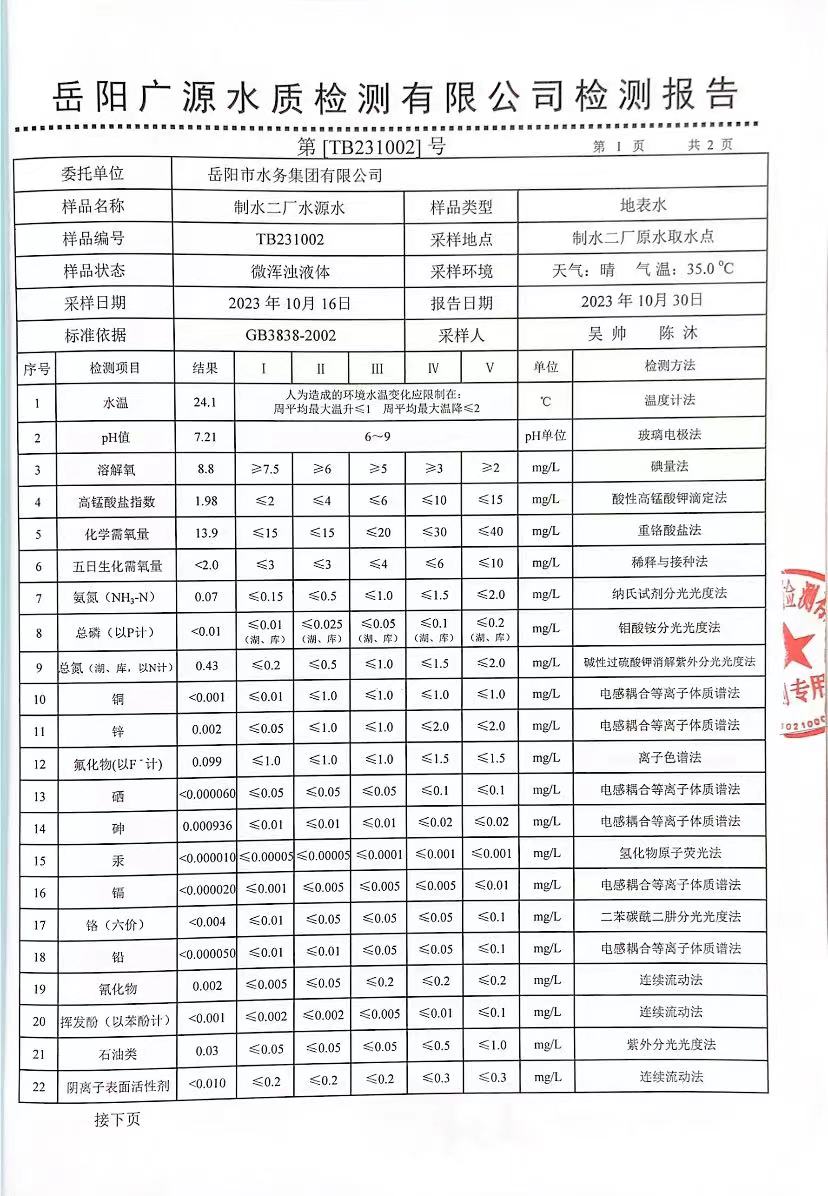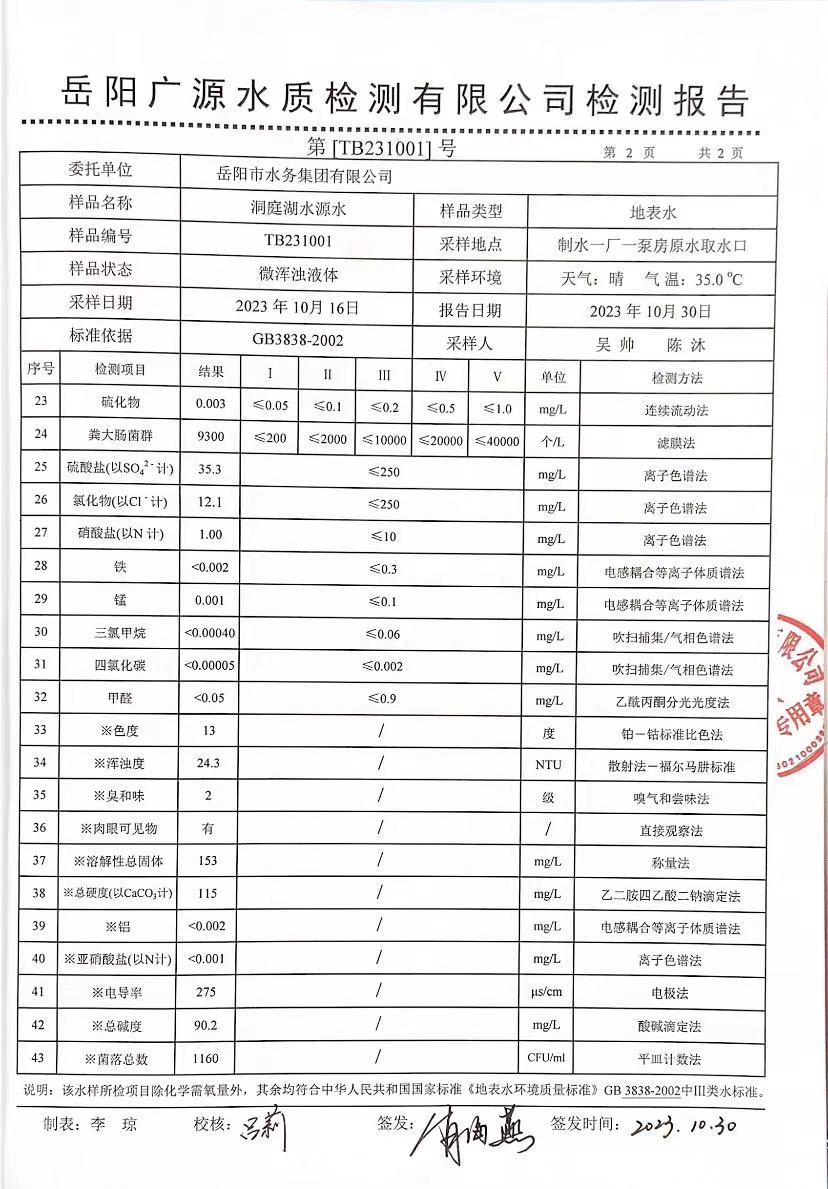 下一篇:2023年10月岳陽市水務(wù)集團出廠水水質(zhì)檢測月報表