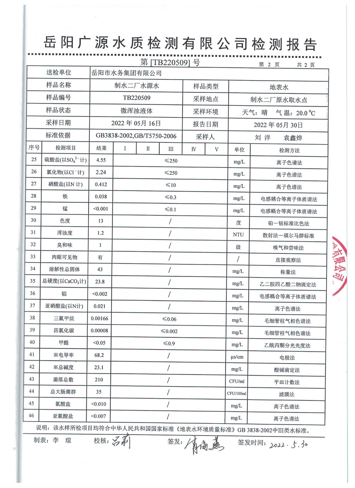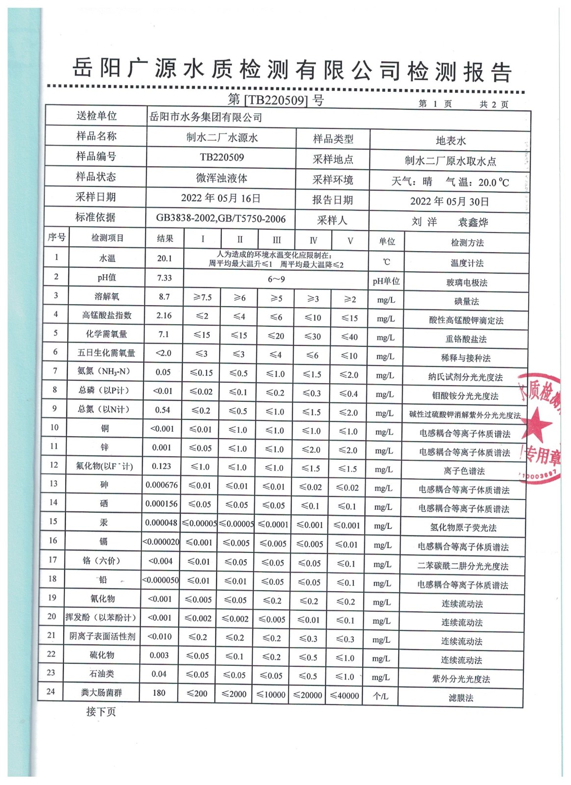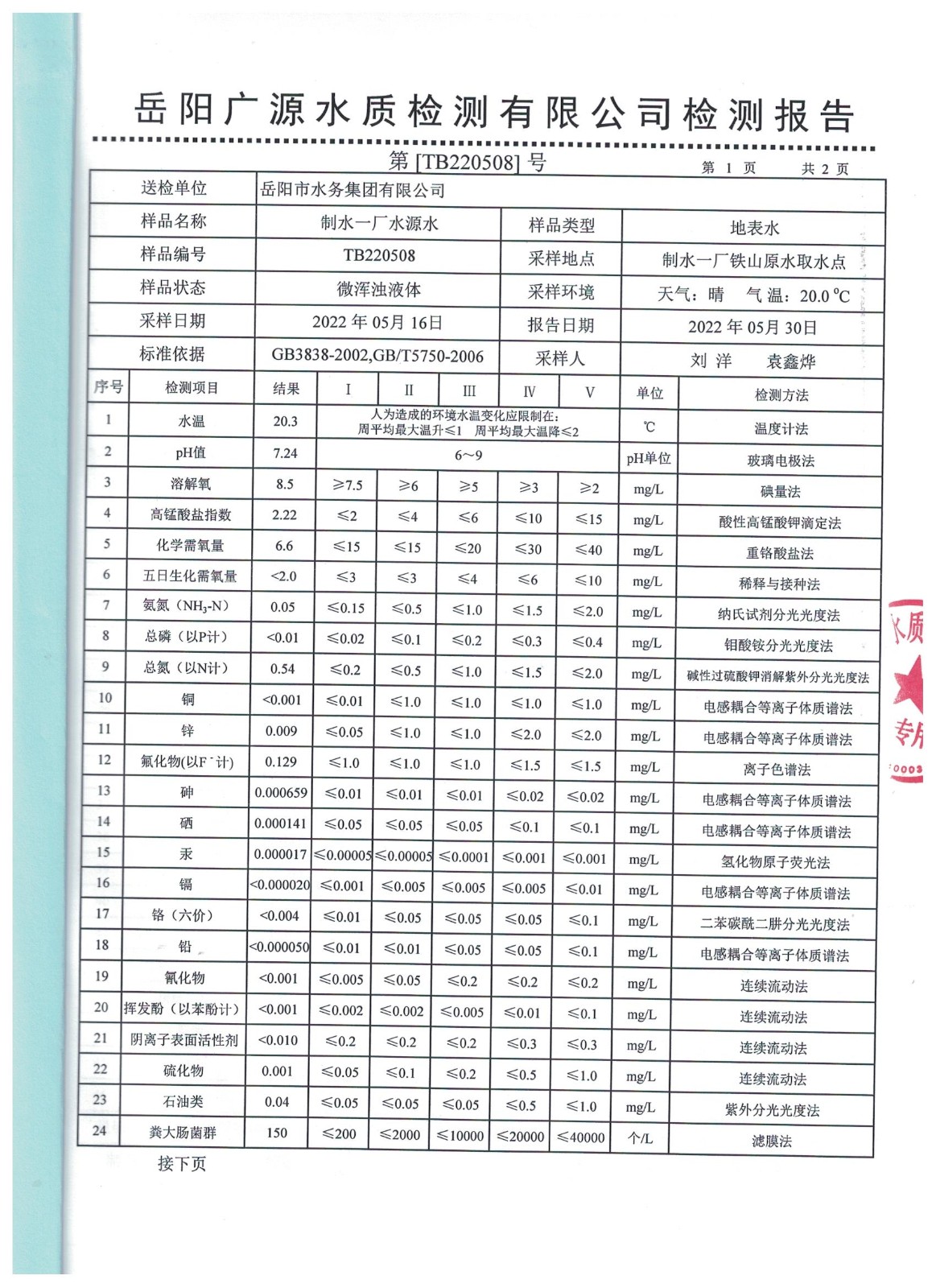 上一篇:2022年05月岳陽市水務(wù)集團(tuán)出廠水水質(zhì)檢測月報表