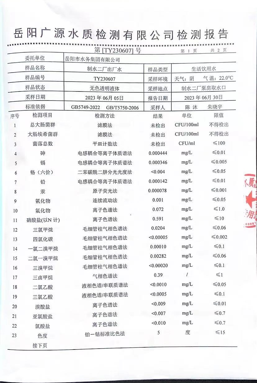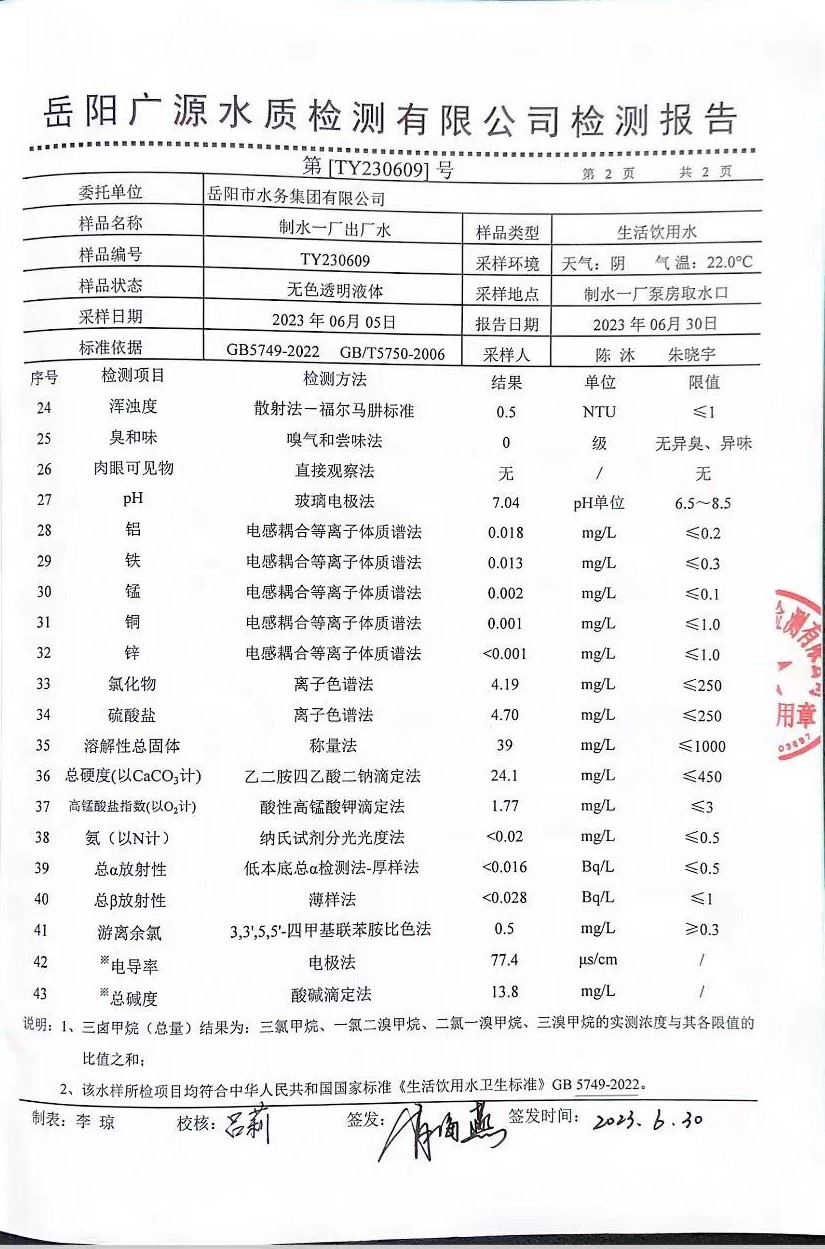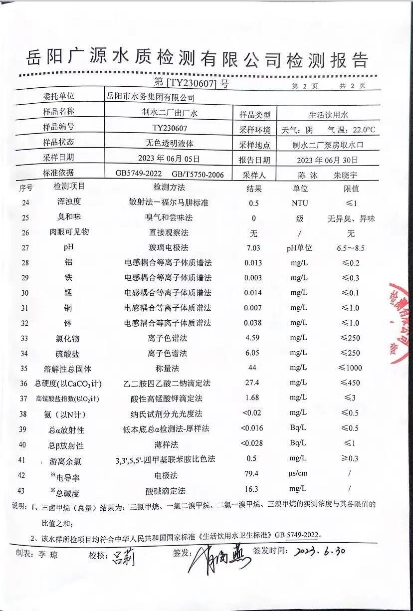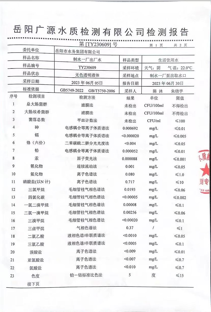 上一篇:2023年6月岳陽市水務(wù)集團(tuán)水源水水質(zhì)檢測月報表
