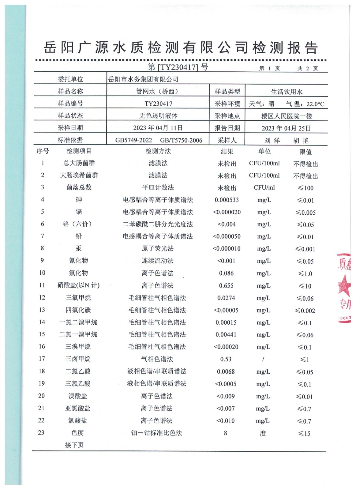 下一篇:2023年4月岳陽(yáng)市水務(wù)集團(tuán)出廠水水質(zhì)檢測(cè)月報(bào)表